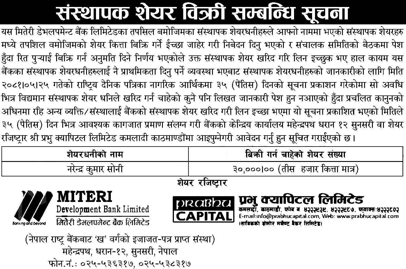 काठमाडौं । मितेरी डेभलपमेन्ट बैंक लिमिटेडले संस्थापक सेयर बिक्रीमा राखेको छ । बैंकले संस्थापक सेयरधनी नरेन्द्र कुमार सोनीको नाममा रहेको ३० हजार कित्ता सेयर बिक्रीमा राखेको हो ।