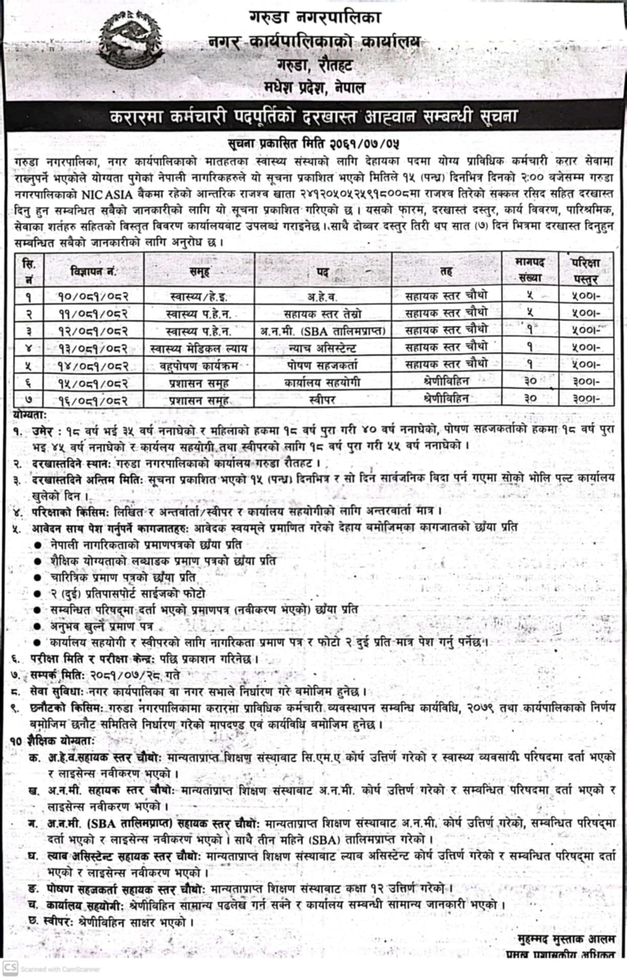 काठमाडौं । रौतहटको गरुडा नगरपालिकाले करार सेवामा ७३ जना कर्मचारी माग गरेको छ । नगरपालिकाले सहायक स्तर चौथो तहका लागि १३ जना र श्रेणीविहीन तहका लागि ६० जना कर्मचारीबाट दरखास्त आह्वान गरेको हो ।