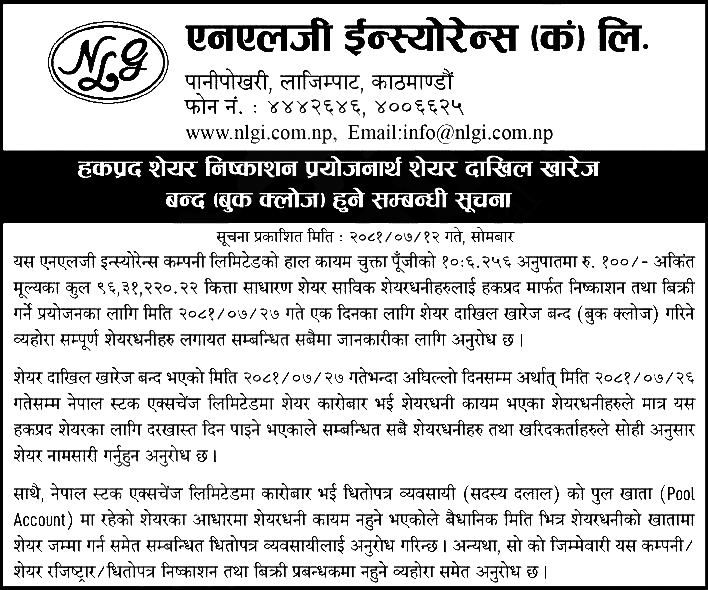 काठमाडौं । एनएलजी इन्स्योरेन्स कम्पनी लिमिटेडले हकप्रद सेयर निष्कासनका लागि कात्तिक २७ गते एक दिन बुक क्लोज गर्ने भएको छ । जस अनुसार कात्तिक २६ गतेसम्म् कायम सेयरधनीले कम्पनीको हकप्रद खरीद गर्न पाउने भएका छन् ।