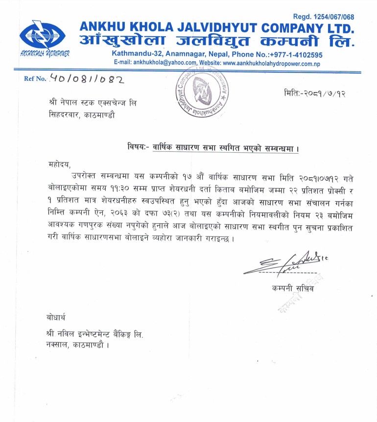 काठमाडौं । आँखुखोला जलविद्युत कम्पनी लिमिटेडको सत्रौं वार्षिक साधारणसभा स्थगित भएको छ । कात्तिक १२ गते बोलाइएको सभा गणपुरक संख्या नपुगेपछि सभा स्थगित भएको कम्पनीले बताएको हो ।