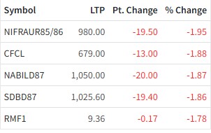 अधिकांश कम्पनीको सेयर मूल्य बढेको दिन आज धेरै मूल्य घट्ने पाँच कम्पनीमा निफ्रा उर्जा रिनपत्र २०८५÷८६, सन्टल फाइनान्स, नविल डिबेन्चर २०८७, सांग्रीला डेभलपमेन्ट बैंक डिबेन्चर २०८७ र आरबीबी म्युचुअल फण्ड–१ छन् । आज सबैभन्दा धेरै निफ्रा उर्जा रिनपत्रको सेयर मूल्य १.९५ प्रतिशत अर्थात् १९ रुपैयाँ ५० पैसाले घटेर ९८० रुपैयाँ पुगेको छ ।
