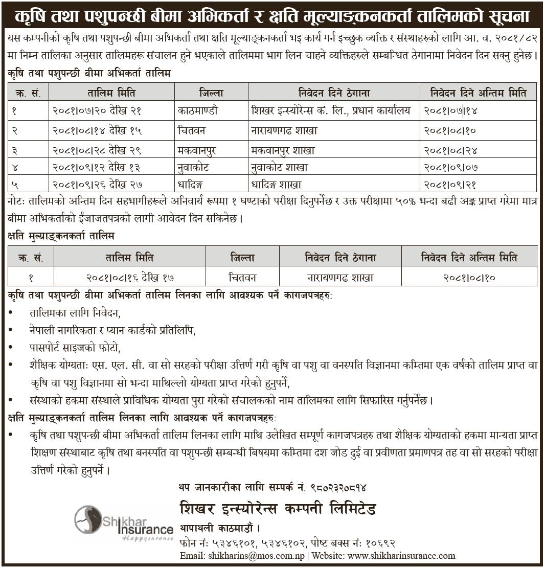 कृषि तथा पशुपन्छी बीमा अभिकर्ताका लागि आवेदन दिने व्यक्ति एसएलसी वा सो सरहको परीक्षा उत्तीर्ण गरी कृषि वा पशु वा वनस्पति विज्ञानमा कम्तीमा एक वर्षको तालिम प्राप्त वा सो भन्दा माथिल्लो योग्यता प्राप्त गरेको हुनुपर्नेछ । क्षति मूल्यांकनकर्ताका लागि कृषि तथा वनस्पति वा पशुपन्छी सम्बन्धी विषयमा कम्तीमा प्लस टू वा प्रवीणता प्रमाणपत्र तह वा सो सरहको परीक्षा उत्तीर्ण गरेको हुनुपर्ने कम्पनीले जनाएको छ । इच्छुक व्यक्तिहरूले सम्बन्धित शाखा कार्यालयमा निवेदन दिन सक्नेछन् ।