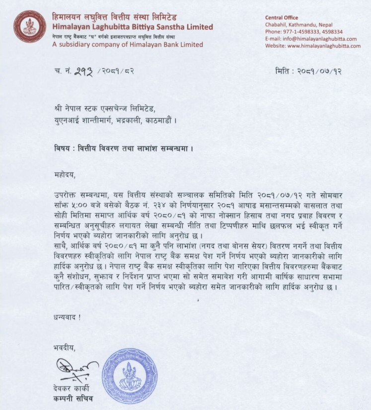 काठमाडौं । हिमालयन लघुवित्त वित्तीय संस्था लिमिटेडले लाभांश नबाड्ने निर्णय गरेको छ । कम्पनीको कात्तिक १२ गते बसेको सञ्चालक समितिको बैठकले गत आर्थिक वर्षबाट कुनै पनि लाभांश (नगद तथा बोनस शेयर) वितरण नगर्ने निर्णय गरेको हो ।