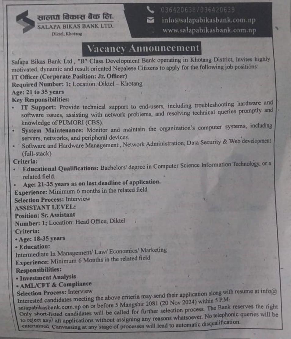 बैंकले आइटी सपोर्ट, सिस्टम मेन्टेनेन्स लगायतका कुरामा अनुभव भएको उम्मेदवारलाई बढी प्राथमिकता दिने सूचनामा उल्लेख गरिएको छ ।