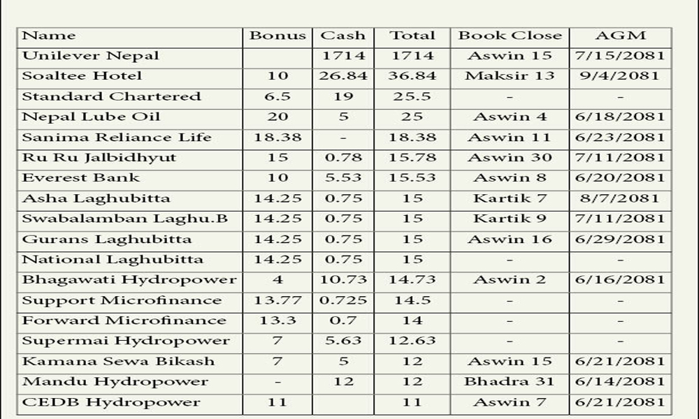 लाभांश घोषणा गर्ने मध्ये युनिलिभर नेपाल लिमिटेडले सबैभन्दा धेरै लाभांश घोषणा गरेको छ । गत वर्षको नाफाबाट यस कम्पनीले सेयरधनीलाई कर सहित प्रतिकित्ता १ हजार ७१४ रुपैयाँ नगद लाभांश घोषणा गरेको छ । बीमा कम्पनीहरुले आर्थिक वर्ष २०७९/८० सम्मको सञ्चित नाफाबाट सेयरधनीलाई लाभांश घोषणा गरेका हुन् भने अन्य कम्पनीहरुले आर्थिक वर्ष २०८०/८१ सम्मको सञ्चित नाफाबाट सेयरधनीलाई लाभांश घोषणा गरेका हुन् ।