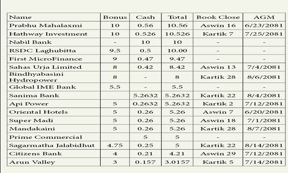 जसमध्ये २७ म्युचुअल फन्ड छन् भने ३५ कम्पनीहरु रहेका छन् । ३५ मध्ये २५ वटाले साधारण सभाको मिति तय गरिसकेका छन् । यी मध्ये धेरैको साधारण सभा सम्पन्न भइसकेको छ भने केही कम्पनीको बाँकी छ । हालसम्म लाभांश घोषणा गरेका कम्पनीमा ७ वाणिज्य बैंक, १ विकास बैंक, २ लगानी कम्पनी, २ जीवन बिमा कम्पनी, २ उत्पादन कम्पनी, २ होटल, ८ लघुवित्त र ११ हाइड्रोपावर कम्पनी छन् । लाभांश घोषणा गरेकामध्ये अधिकांश कम्पनीले बोनस सेयरलाई प्राथमिकता दिएका छन् । लगानीकर्तालाई छुट्याइएको बोनस सेयरमा कर लाग्ने भएकाले केहीले कर प्रयोजनका लागि मात्रै नगद लाभांश घोषणा गरेका छन् ।