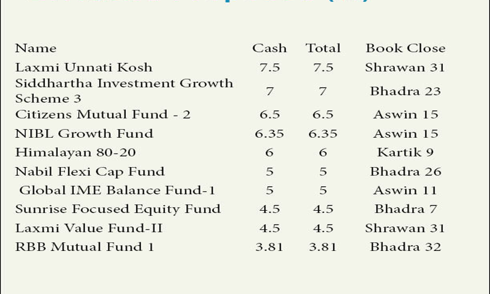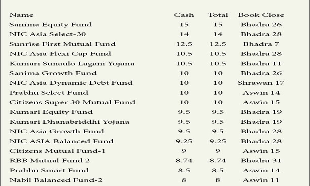 यस्तै, लाभांश घोषणा गर्नेमा म्युचुअल फन्डहरुको बाहुल्यता रहेको छ । हालसम्म २७ म्युचुअल फन्डले गत वर्षको नाफाबाट लाभांश घोषणा गरेका छन् । यी सबैले बुक क्लोजको मिति तय गरिसकेका छन् । यी मध्ये अधिकांशले त लगानीकर्ताको खातामा नगद लाभांश पनि जम्मा गरिसकेका छन् । म्युचुअल फन्ड मध्ये सबैभन्दा धेरै लाभांश घोषणा गर्नेमा सानिमा इक्विटी फन्ड रहेको छ । यसले गत वर्षको नाफाबाट इकाइधनीलाई १५ प्रतिशत बोनस सेयर घोषणा गरेको छ । एनआइसी एसिया सेलेक्ट ३० ले १४ प्रतिशत नगद लाभांश दिने जनाएको छ ।