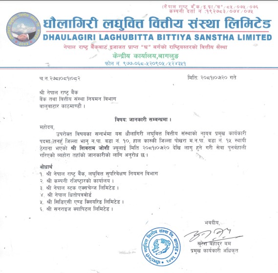 धौलागिरी लघुवित्तको डीसीईओमा जोशीको पुनर्वहाली