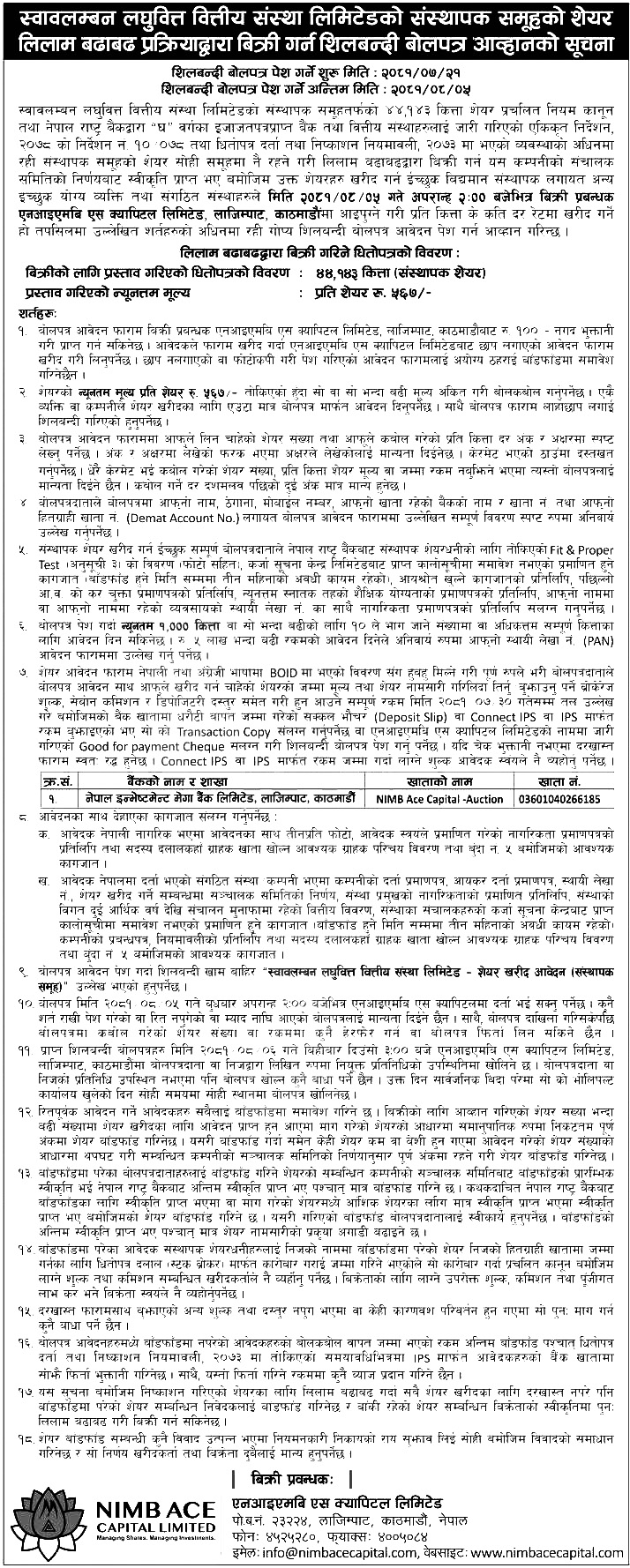 इच्छुक लगानीकर्ताले आफूले किन्न चाहेको सेयर संख्या र सोको मूल्य समेत खुलाई मंसिर ५ गते दिउँसो २ बजेभित्र बिक्री प्रबन्धक एनआइएमबि एस क्यापिटल लिमिटेड, लाजिम्पाट, काठमाडौंमा गोप्य शिलबन्दी बोलपत्र पेश गर्नु पर्नेछ ।