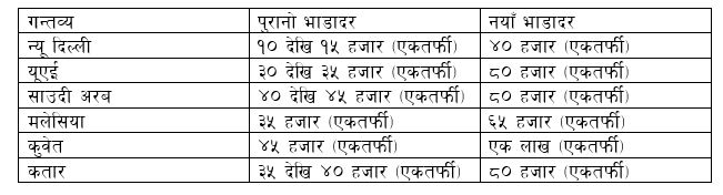 अहिले बढाएर एक लाख रुपैयाँ पुर्याइएको छ । उडान अवधि कटौती हुँदा यात्रुको चाप बढ्ने भएकाले त्यसको लाभ लिन एयरलाइन्सहरुले भाडा बढाएका हुन् । यसको प्रत्यक्ष मारमा नेपाली श्रमिकहरु पर्ने नेपाल वैदेशिक रोजगार व्यवसायी संघका अध्यक्ष राजेन्द्र भण्डारी बताउँछन् ।