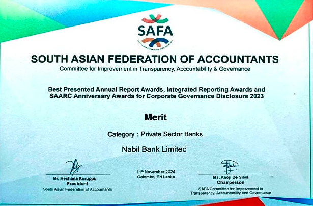 दक्षिण एसियाका निजी क्षेत्र बैंकिङतर्फ आर्थिक वर्ष सन् २०२२/२३ को वित्तीय प्रतिवेदनका आधारमा नबिल बैंकको वित्तीय पारदर्शिता, जबाफदेहिता तथा सुशासनको लागि यो अवार्ड प्रदान गरिएको साफाले जनाएको छ । साफाले हरेक वर्ष दक्षिण एसियाका विभिन्न वित्तीय संस्थाहरूको वार्षिक प्रतिवेदनको मूल्यांकन गर्दै उत्कृष्टलाई सम्मान प्रदान गर्छ । साउनमा नबिल बैंकले नेपाल चार्टर्ड एकाउन्टेन्ट संस्था (आइक्यान)बाट वाणिज्य बैंकतर्फको उत्कृष्ट वित्तीय प्रतिवेदन अवार्ड (गोल्ड) जितेको थियो ।