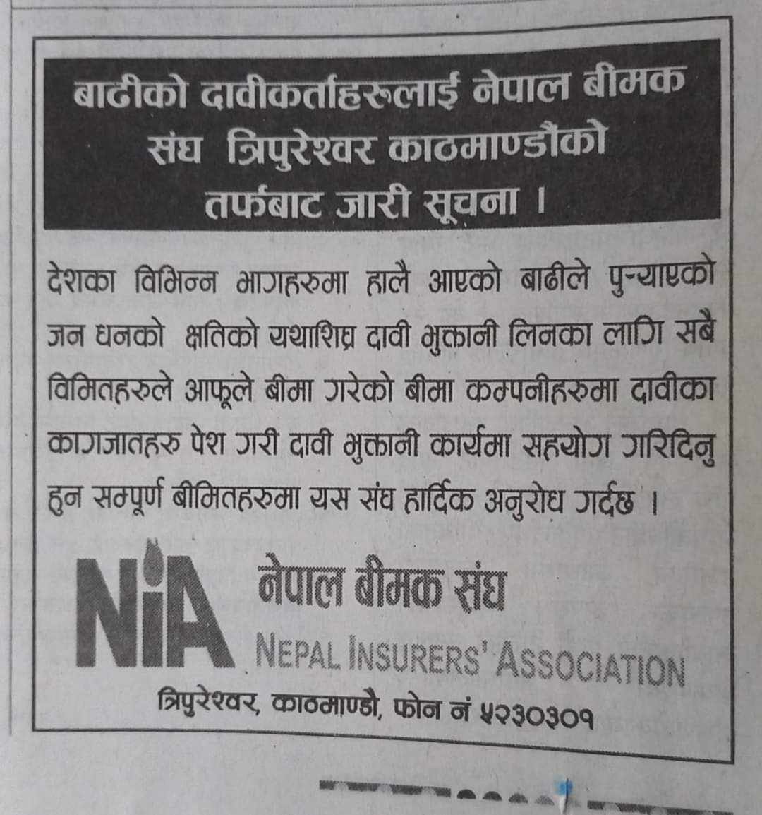 संघले जारी गरेको सूचनामा देशका विभिन्न भागहरुमा असोज महिनामा आएको बाढीले पुर्याएको जन धनको क्षतिको यथाशिघ्र रुपमा दावी भुक्तानी लिन सबै कम्पनीरुमा दावीका कागजात पेश गर्न अनुरोध गरेको हो ।