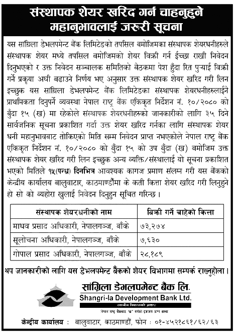 काठमाडौं । सांग्रिला डेभलपमेन्ट बैंक लिमिटेडले संस्थापक समूहको सेयर सर्वसाधारणका लागि बिक्रीमा राखेको छ । बैंकले तीन जना संस्थापक सेयरधनीहरूको नाममा रहेको १ लाख ९ हजार ९३ कित्ता सेयर बिक्रीमा राखेको हो ।