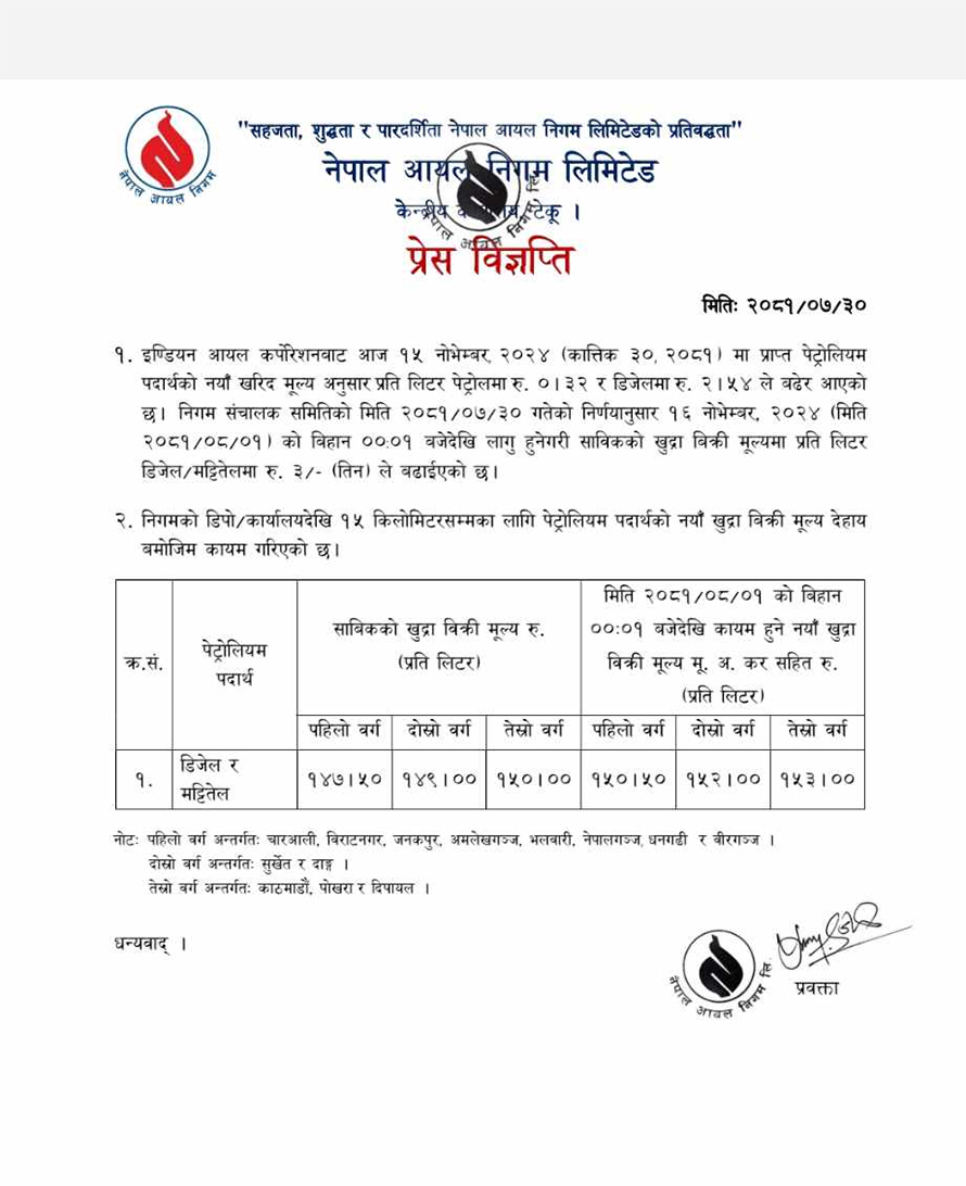 यो मूल्य शनिबार मध्यराति १२ बजेदेखि लागू हुनेछ । मूल्य बढेपछि चारआली, विराटनगर, जनकपुर, अमलेखगञ्ज, भलबारी, नेपालगञ्ज, धनगढी र वीरगञ्ज क्षेत्रमा डिजेल र मट्टितेलको मूल्य प्रतिलिटर १५० रुपैयाँ कायम भएको छ ।