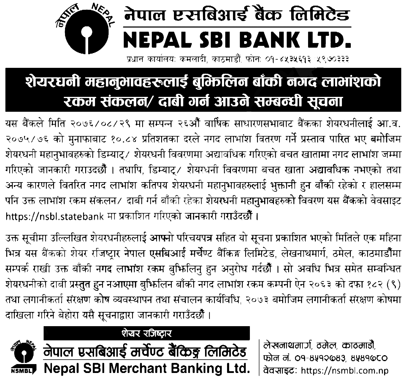बैंकले सेयरधनीहरूलाई लाभांश प्राप्त गर्न डिम्याट खातामा बैंक खाता विवरण अद्यावधिक गर्न पनि भनेको छ । यसका लागि सेयरधनीले एक महीनाभित्र आफ्नो बैंक खाता नम्बर, नागरिकता र अन्य आवश्यक कागजातहरू तयार गरी नेपाल एसबीआई मर्चेन्ट बैंकिङ लिमिटेडको कार्यालयमा सम्पर्क गर्नु पर्नेछ ।