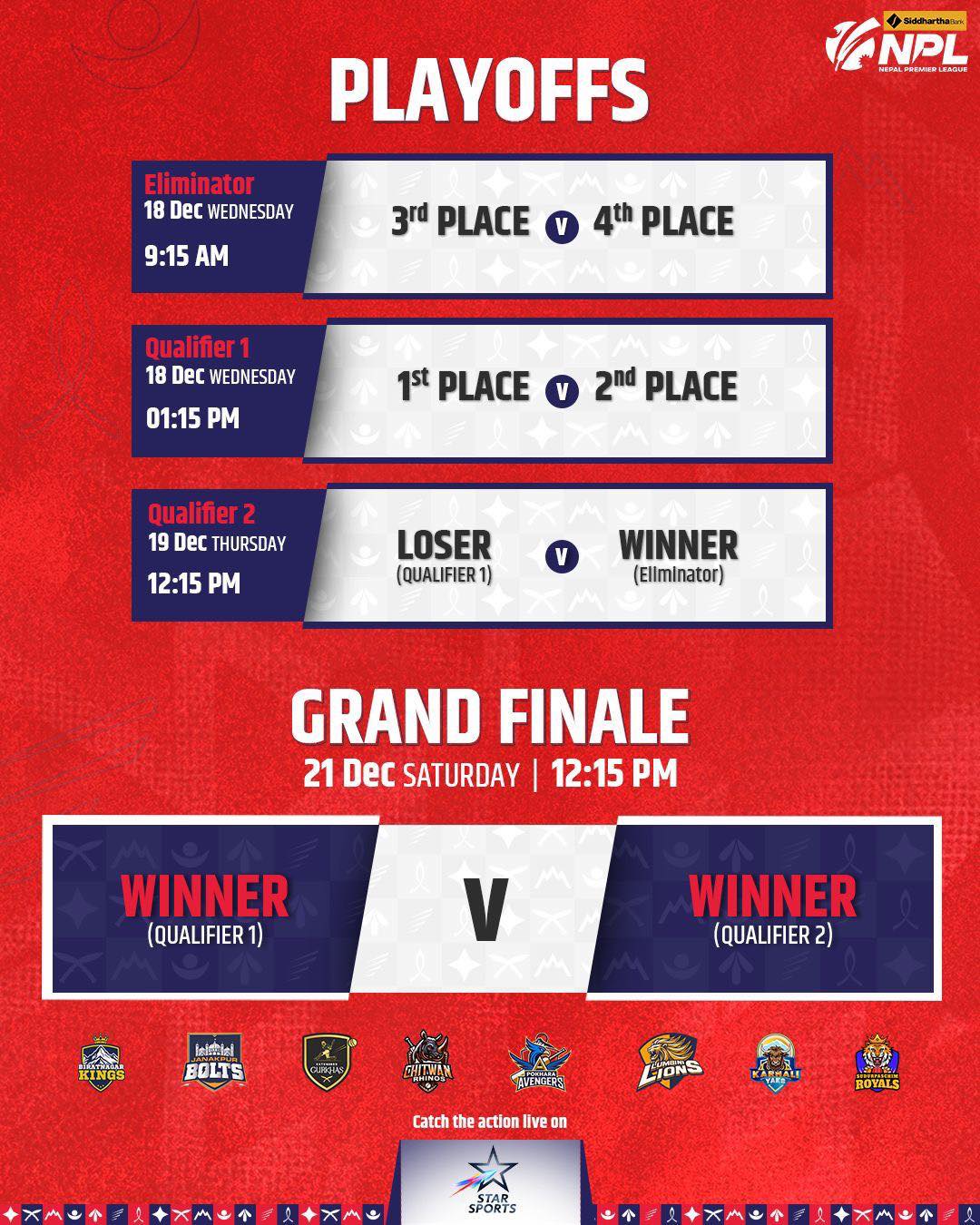 सार्वजनिक गरेको तालिकाअनुसार पहिलो खेल मंसिर १५ गते जनकपुर बोल्टस र विराटनगर किंग्सबिच हुनेछ । मंसिर १६ गते उपनिर्वाचन भएकाले खेल राखिएको छैन । मंसिर १७ गतेदेखि दैनिक २ खेल हुनेछ । पुस ३ गतेदेखी प्लेअफका खेल हुनेछ । फाइनल खेल पुस ६ गते हुनेछ । एनपीएलमा ८ फेन्चाइच टोली सहभागी छन् ।