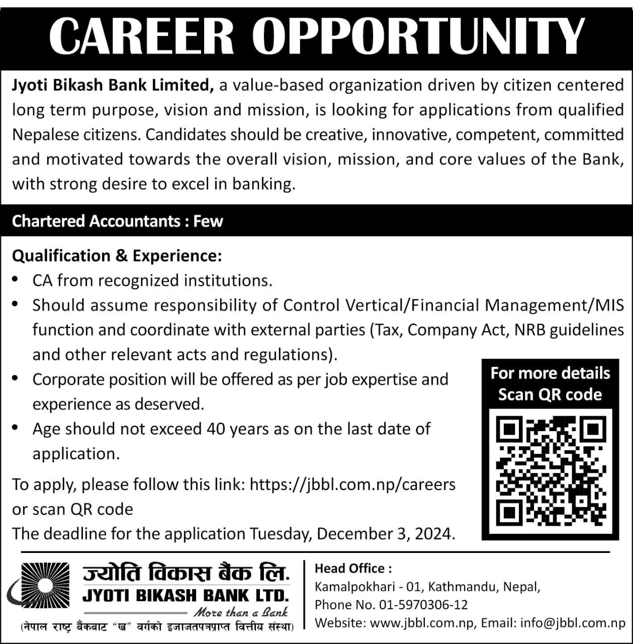 इच्छुक उम्मेदवारहरुले बैंकको वेबसाइट https://www.jbbl.com.np/careers/chartered-accountants-few/apply/chartered-accountants-few मार्फत डिसेम्बर ३ भित्र आवेदन दिन सक्ने बैंकले जनाएको छ ।