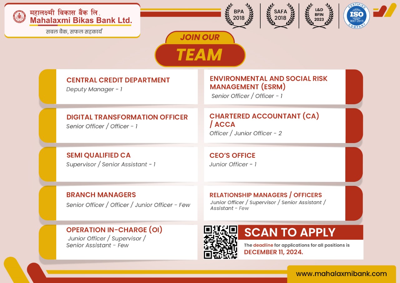 उक्त पदहरुमा आवेदन दिनको लागि सूचनामा उल्लेख गरिएको क्यूआर स्क्यान गरी आफु योग्य रहेको पदमा आवेदन दिन सकिने बैंकले जनाएको छ ।