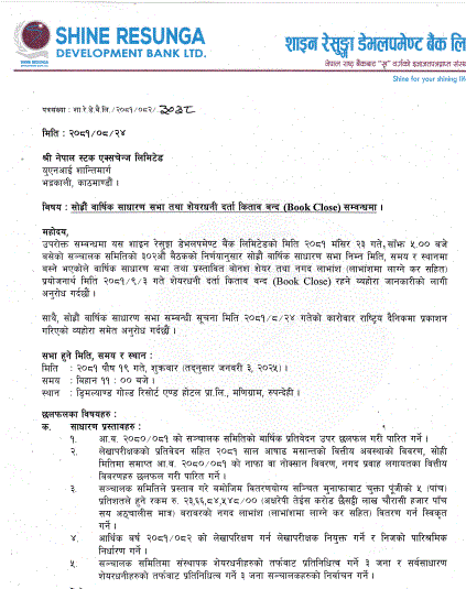 काठमाडौं । शाइन रेसुंगा डेभलपमेन्ट बैंकले लाभांश वितरण गर्ने प्रस्ताव पारित गर्न साधारणसभा बोलाएको छ । सो बैंकको आइतबार बसेको सञ्चालक समितिको ३०२ औं बैठकले पुस १९ गते ड्रिमल्याण्ड गोल्ड रिसोर्ट एण्ड होटल, मणिग्राम, रुपन्देहीमा सभा बस्ने निर्णय गरेको हो ।