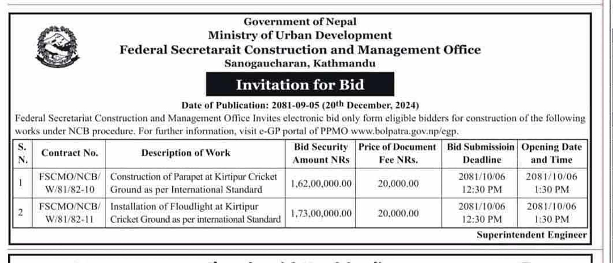 प्यारापिटका लागि १ करोड ६२ लाख र फ्लडलाइटका लागि १ करोड ७३ लाख रुपैयाँ लागत छ । बोलपत्र पेश गर्न २०–१० हजार रुपैयाँ लाग्ने छ । बोलपत्र पेश गर्ने म्याद आगामी माघ ६ गते दिउँसो १२ः३० बजेसम्म छ । सोही दिन दिउँसो साढे १ बजे बोलपत्र खोलिने सूचनामा उल्लेख छ ।