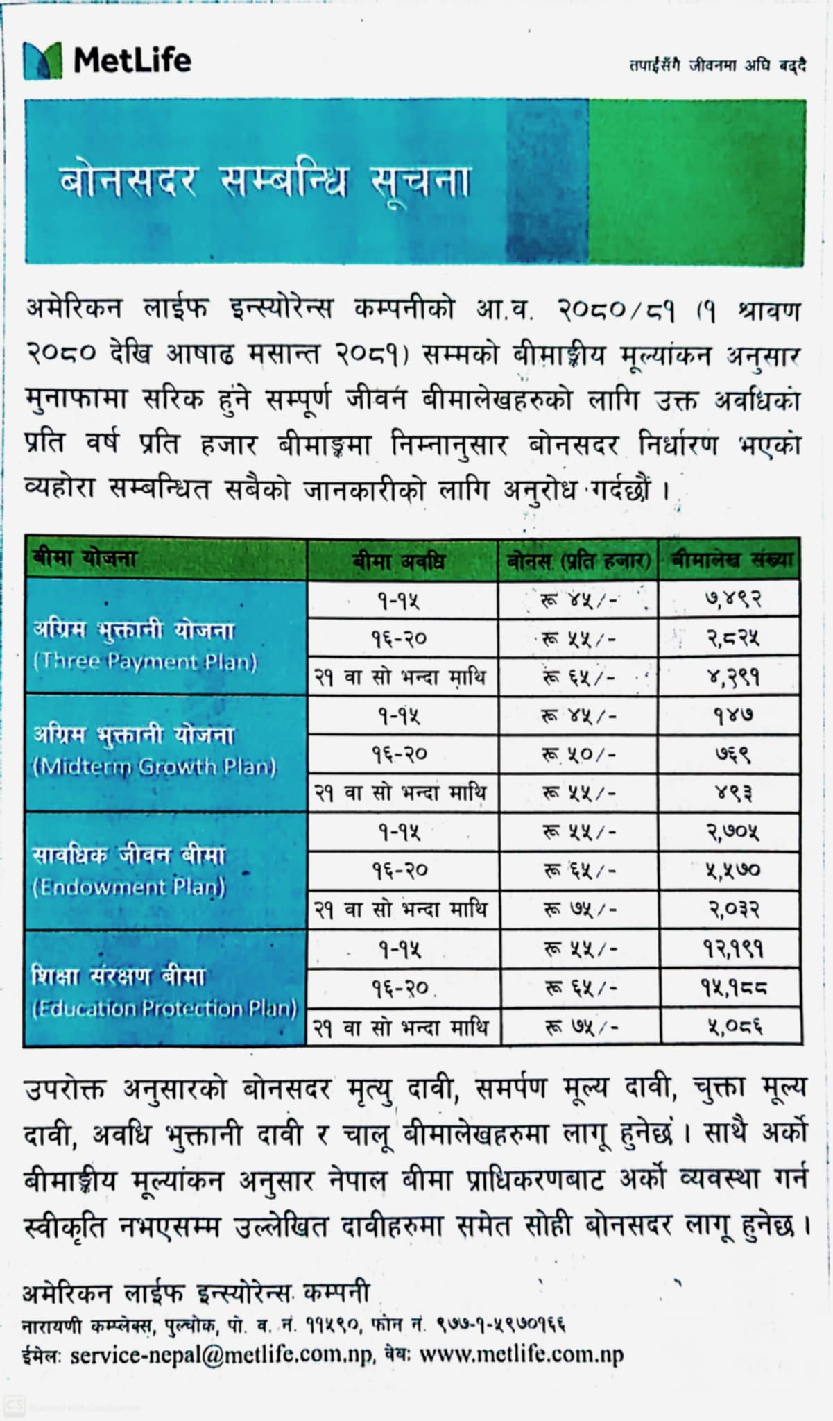 त्यस्तै मेट लाइफले सावधिक जीवन बीमा योजनाको १ देखि १५ वर्षे बीमा अवधिमा ५५ रुपैयाँ, १६ देखि २० वर्ष अवधिमा ६५ रुपैयाँ र २१ वर्ष वा सोभन्दा माथिको अवधिको बीमा योजनामा ७५ रुपैयाँ अधिकतम बोनस दिने जनाएको छ । कम्पनीले अर्को बीमा योजना शिक्षा संरक्षण बीमामा पनि अधिकतम ७५ रुपैयाँसम्म बोनस दिने भएको छ। जसमा १ देखि १५ वर्ष अवधिको योजनामा ५५ रुपैयाँ, १६ देखि २० वर्ष अवधिको योजनामा ६५ रुपैयाँ र २१ वर्ष वा सोभन्दा माथिको बीमा योजनामा ७५ रुपैयाँ बोनस दिने जनाएको छ ।