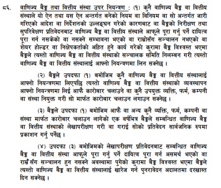 राष्ट्र बैंक ऐन २०५८ को दफा ८६ बमोजिम समस्या ग्रस्त घोषित बैंकलाई राष्ट्र बैंकले नियन्त्रणमा लिने गर्छ । उक्त दफामा वाणिज्य बैंक तथा वित्तीय संस्था उपर नियन्त्रण सम्बन्धी व्यवस्था गरिएको छ । जसको उफदफा (१) मा कुनै वाणिज्य बैंक वा वित्तीय संस्थाले यो ऐन तथा यस ऐन अन्तर्गत बनेको नियम वा विनियम वा सो अन्तर्गत जारी गरिएको आदेश वा निर्देशनको उल्लङ्घन गरेको कारणबाट वा बैंकको निरीक्षण तथा सुपरिवेक्षण प्रतिवेदनबाट वाणिज्य बैंक वा वित्तीय संस्थाले आफूले पूरा गर्नु पर्ने दायित्व पूरा गर्न नसकेको वा नसक्ने सम्भावना भएको वा राम्रोसँग सञ्चालन नभएको वा सेयर होल्डर वा निक्षेपकर्ताको अहित हुने कार्य गरेको कुरामा बैंक विश्वस्त भएमा बैंकले त्यस्तो वाणिज्य बैंक वा वित्तीय संस्थाको सञ्चालक समिति निलम्बन गरी त्यस्तो वाणिज्य बैंक वा वित्तीय संस्थालाई आफ्नो नियन्त्रणमा लिन सक्नेछ । भनिएको छ ।