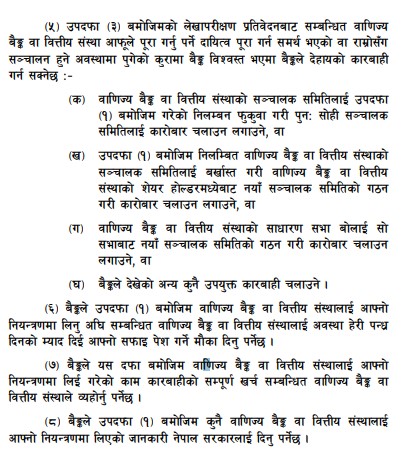 त्यस्तै उफ दफा (२) मा बैंकले उपदफा (१) बमोजिम कुनै वाणिज्य बैंक वा वित्तीय संस्थालाई आफ्नो नियन्त्रणमा लिएपछि त्यस्तो वाणिज्य बैंक वा वित्तीय संस्थाको व्यवस्थापन आफ्नो नियन्त्रणमा लिई आफै कारोबार चलाउने वा कुनै उपयुक्त व्यक्ति, फर्म, कम्पनी वा संस्था नियुक्त गरी सो मार्फत कारोबार चलाउन लगाउन सक्नेछ ।