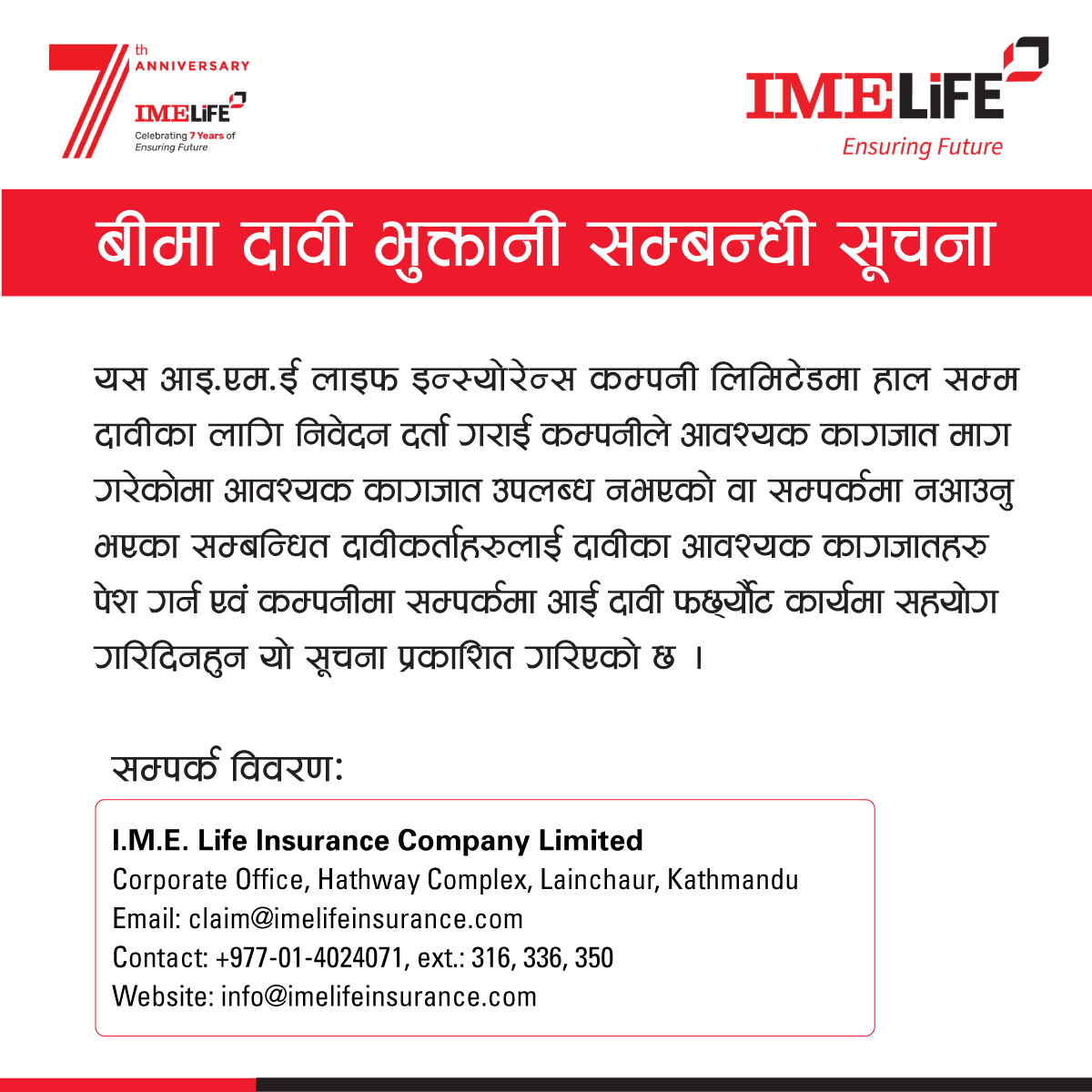 आइएमई लाइफ इन्स्योरेन्सले कम्पनीमा बीमा दावी भुक्तानीको लागि निवेदन दिएका बीमितहरुलाई सक्दो चाँडो आवश्यक कागजात पेश गरी दावी भुक्तानीमा सहयोग गरिदिन आम बीमितहरुलाई अनुरोध गरेको छ ।