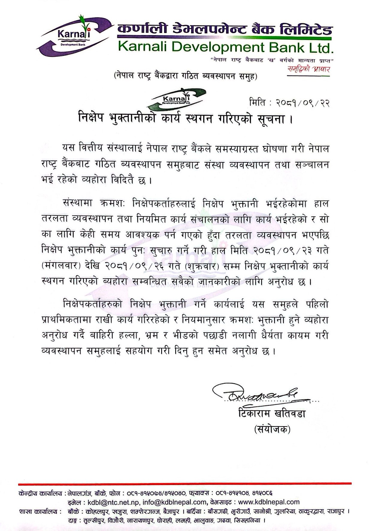 काठमाडौं । समस्याग्रस्त कर्णाली डेभलपमेन्ट बैंकबाट ग्राहकलाई निक्षेप भुक्तानी कार्य स्थगित गरिएको छ । नेपाल राष्ट्र बैंकबाट गठित व्यवस्थापन समूहका संयोजक टीकाराम खतिवडाले एक सूचना जारी गर्दै (आज) पुस २३ गतेबाट पुस २६ गतेसम्मका लागि निक्षेप भुक्तानी कार्य स्थगन गरिएको जानकारी गराएका हुन् ।