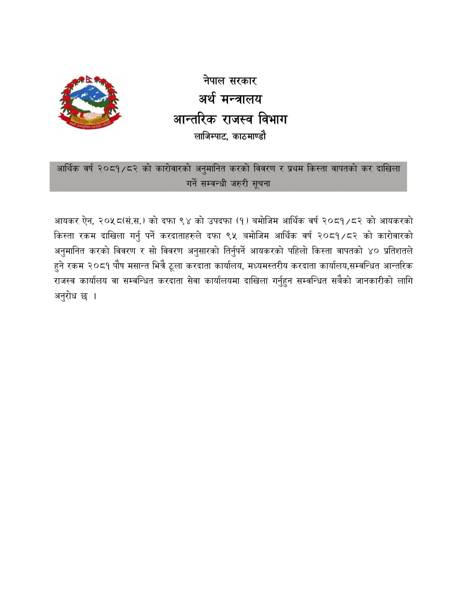 आयकर ऐन, २०५८ (संशोधनसहित) को दफा ९४ को उपदफा ९१० बमोजिम, आव २०८१/८२ को आयकरको किस्ता रकम दाखिला गर्नुपर्ने करदाताहरूले, दफा ९५ बमोजिम, आव २०८१/८२ को कारोबारको अनुमानित करको विवरण र सो विवरण अनुसारको तिर्नुपर्ने आयकरको पहिलो किस्ताबापतको ४० प्रतिशत रकम २०८१ पुस मसान्तभित्रै तिर्नु पर्ने व्यवस्था रहेको विभागले उल्लेख गरेको हो ।