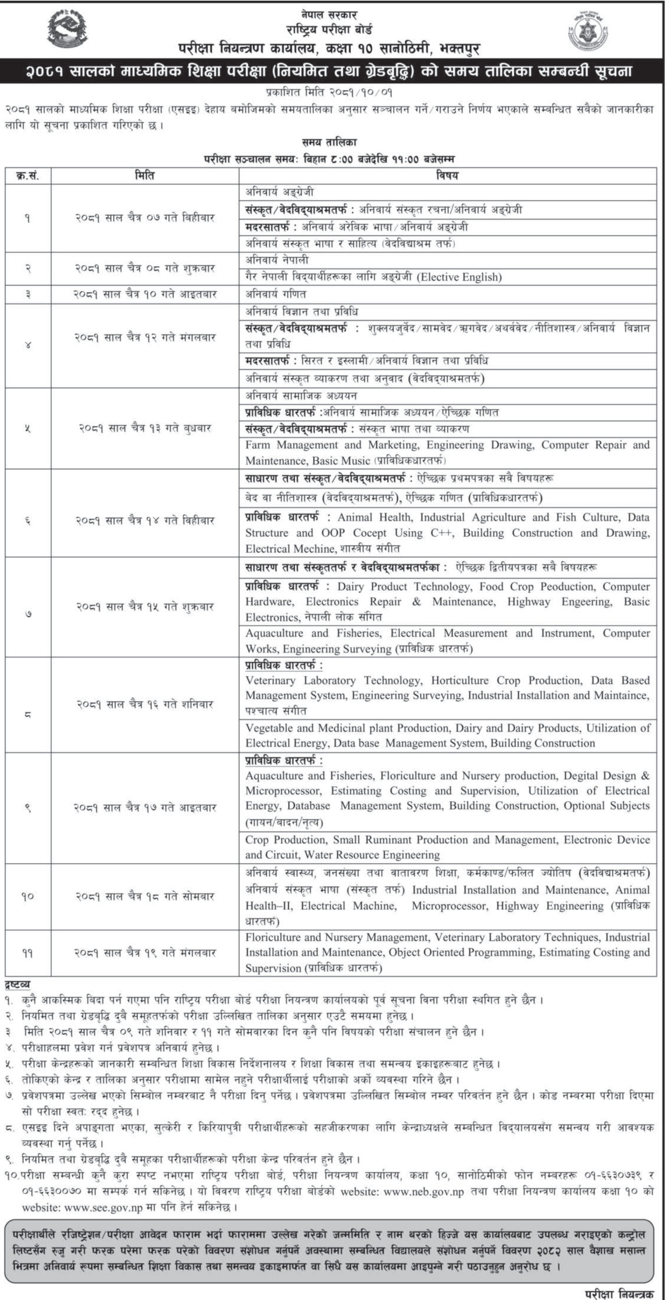 एसईई परीक्षा चैत ७ गतेदेखि सुरु हुनेछ । पहिलो दिन अनिवार्य अंग्रेजी, दोस्रो दिन अनिवार्य नेपाली, चैत १० गते अनिवार्य गणित, १२ गते अनिवार्य विज्ञान विषयको परीक्षा हुने परीक्षा नियन्त्रण कार्यालयले जनाएको छ ।