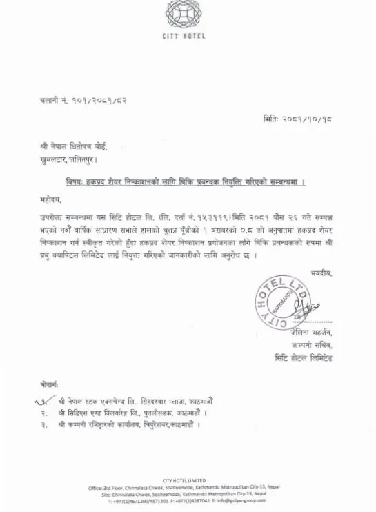 काठमाडौं । सिटी होटल लिमिटेडले हकप्रद सेयर निष्कासनको लागि बिक्री प्रबन्धक नियुक्त गरेको छ । कम्पनीको हकप्रद सेयर निष्कासन तथा बिक्री प्रबन्धकमा प्रभु क्यापिटल लिमिटेड नियुक्त गरेको हो ।