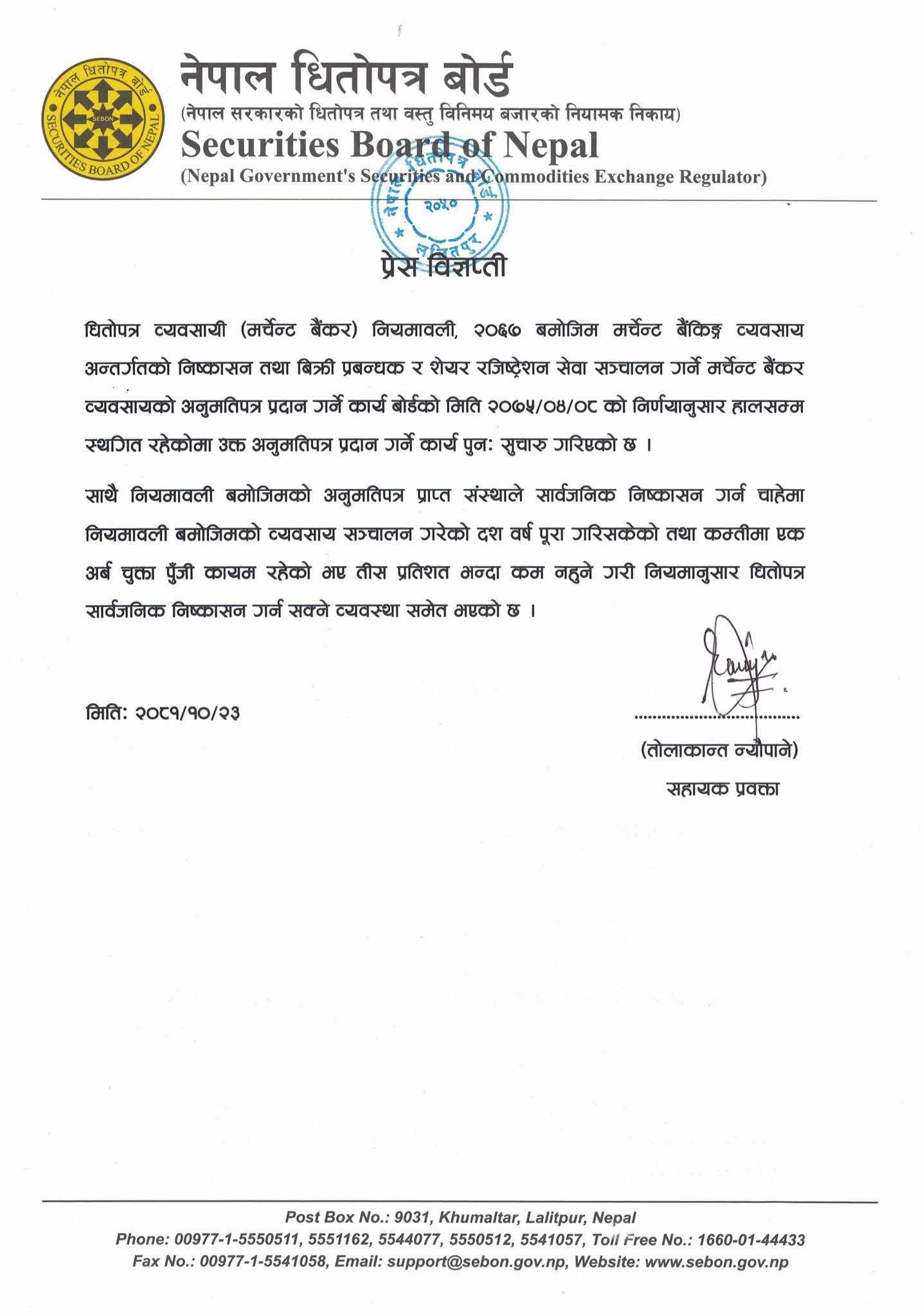 यस अघि २०७५ सालको साउन ८ गतेको निर्णय अनुसार मर्चेन्ट बैंकर व्यवसायको अनुमतिपत्र दिने प्रक्रिया स्थगित गरिएको थियो । धितोपत्र व्यवसायी मर्चेन्ट बैंकर नियमावली २०६७ बमोजिम मर्चेन्ट बैकिङ्ग व्यवसाय अन्तर्गतको निष्कासन तथा बिक्री प्रबन्धक र सेयर रजिष्ट्रेशन सेवा सञ्चालन गर्ने मर्चेन्ट बैंकर व्यवसायको अनुमतिपत्र प्रदान गर्ने कार्य हाल पुनः प्रारम्भ गरिएको छ,’ नेपाल धितोपत्र बोर्डले जारी गरेको विज्ञप्तिमा भनेको छ ।