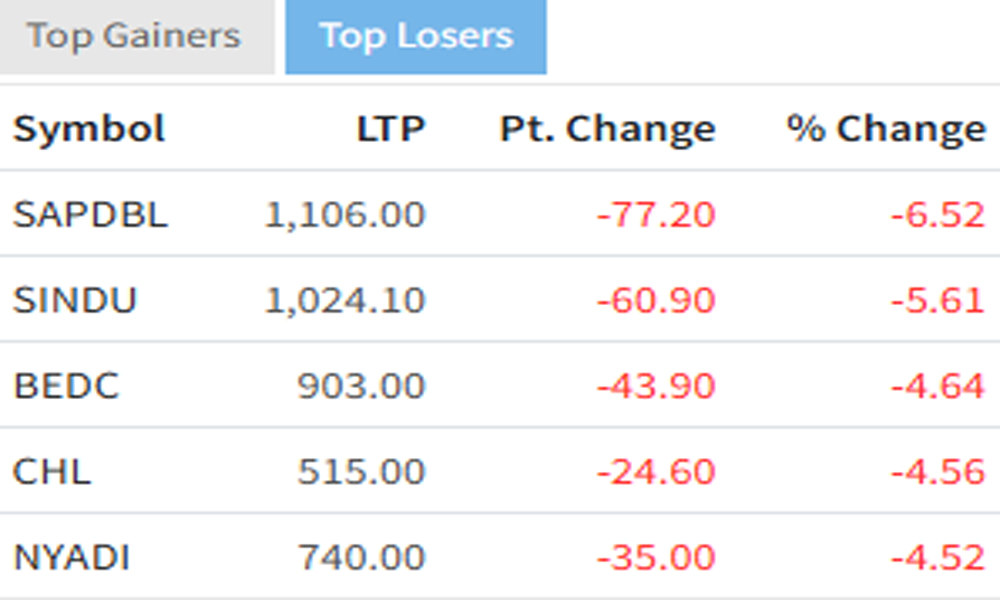 काठमाडौं । आइतबारको सेयर बजार कारोबार बन्द हुँदा परिसूचक दोहोरो अंकले घटेर बन्द भयो । कारोबार भएका कम्पनीमध्ये १६८ कम्पनीको सेयर मूल्य घटेको दिन धेरै मूल्य घट्ने पाँच कम्पनीमा सप्तकोशी डेभलपमेन्ट बैंक, सिन्धु विकास बैंक, भूगोल इनर्जि, छ्याङदी हाइड्रोपावर र न्यादी हाइड्रोपावरको सेयर मूल्य सबै भन्दा धेरै घटेको हो ।
