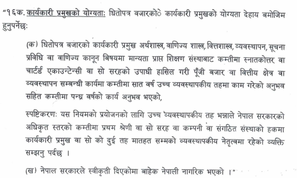 धितोपत्र बजार सञ्चालन नियमावाली, २०७९ को दाफ १६ क मा कार्यकारी प्रमुखको योग्यताको व्यवस्था गरिएको छ । जसअनुसार धितोपत्र बजारको कार्यकारी प्रमुख बन्नका लागि अर्थशास्त्र, वाणिज्य शास्त्र, वित्तशास्त्र, व्यवस्थापन, सूचना प्रविधि वा वाणिज्य कानून विषयमा मान्यता प्राप्त शिक्षण संस्थाबाट कम्तीमा स्तातकोत्तर वा चार्टर्ड एकाउन्टेन्सी वा सो सरहको उपाधी हासिल गरी पुँजी बजार वा वित्तीय क्षेत्र वा व्यवस्थापनसम्बन्धी कार्यमा कम्तीमा ७ वर्ष उच्च व्यवस्थापकीय तहमा काम गरेको अनुभवसहित कम्तीमा १५ वर्षको कार्य अनुभव भएको हुनुपर्ने छ ।