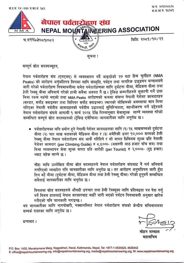 काठमाडौं । नेपाल पर्वतारोहण संघले हिमाल आरोहण गर्न चाहनेहरुका लागि सहुलियत दरको नयाँ बीमा स्कीम सार्वजनिक गरेको छ । संघले सलिकोसँगको सहकार्यमा यसअघि २० हजार रुपैयाँ भन्दाबढी बीमाशुल्क पर्ने हिमाल आरोहण सम्बन्धी बीमा स्कीम जम्मा १० हजार ५०० रुपैयाँमा उपलब्ध हुने जनाएको छ ।