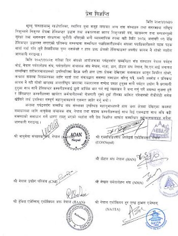 त्यस्तै विज्ञप्तिमा पर्यटनसँग सम्वन्धी संघ संस्थाका उपस्थित व्यक्तिहरुले हाल उक्त क्षेत्रमा देखिएका समस्या समाधानका लागि वायुसेवा संचालक संघ, नेपाल तथा सदस्य कम्पनीहरुलाई साथ दिई एकवद्धता साथ अघि वढी समस्याको समाधान गर्ने धारण राखेको बताइएको छ ।