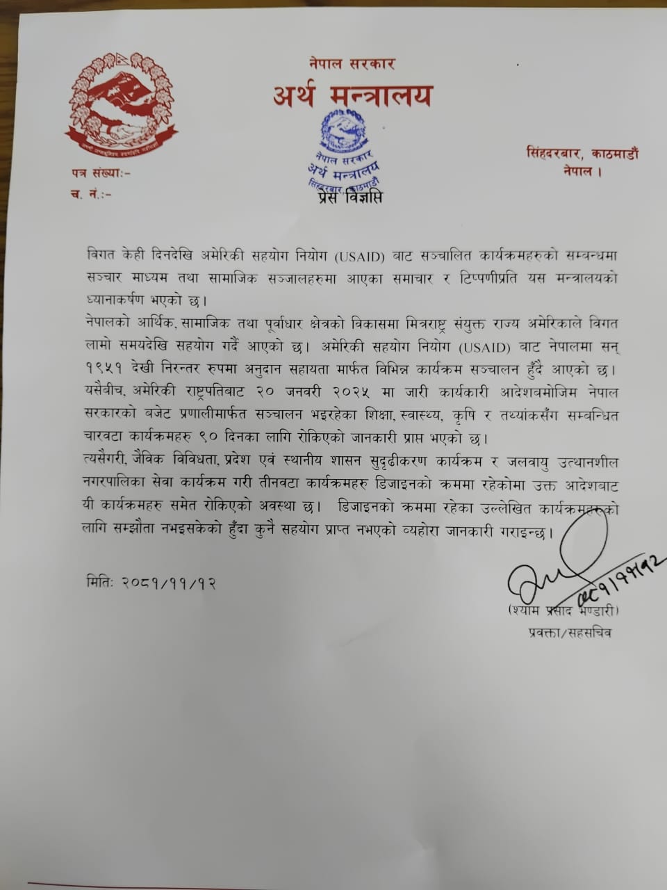 मन्त्रालयका प्रवक्ता श्याम प्रसाद भण्डारीले जारी गरेको विज्ञप्तिमा अहिले यो कार्यक्रम ९० दिनका लागि मात्रै रोकिएको जानकारी भएको भन्दै गलत प्रचार भएको उल्लेख गरिएको छ । ‘नेपालको आर्थिक, सामाजिक तथा पूर्वाधार क्षेत्रको विकासमा मित्रराष्ट्र अमेरिकाले विगत लामो समयदेखि सहयोग गर्दै आएको छ । अमेरिकी सहयोग नियोग युएसआईडी बाट नेपालमा सन् १९५१ देखि निरन्तर रुपमा अनुदान सहायता मार्फत विभिन्न कार्यक्रम सञ्चालन हुदै आएको छ । यसै बीच अमेरिकी राष्ट्रपतिबाट सन् २०२५ को जनावरी २० देखि जारी कार्यकारी आदेशबमोजिम नेपाल सरकारको बजेट प्रणाली मार्फत सञ्चालन भइरहेका शिक्षा, स्वास्थ्य, कृषि र तथ्यांकसँग सम्बन्धित चारवटा कार्यक्रमहरु ९० दिनका लागि रोकिएको जानकारी प्राप्त भएको छ,’ विज्ञप्तिमा भनिएको छ ।