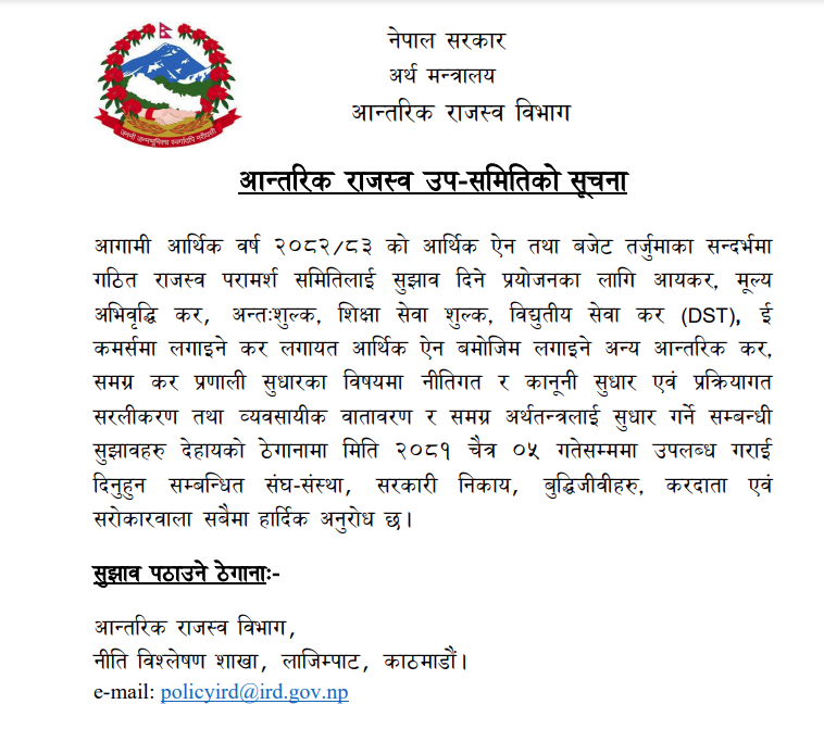 आर्थिक ऐनबमोजिम लगाइने अन्य आन्तरिक कर, समग्र कर प्रणाली सुधारका विषयमा नीतिगत र कानुनी सुधार एवं प्रक्रियागत सरलीकरण तथा व्यवसायीक वातावरण र समग्र अर्थतन्त्रलाई सुधार गर्नेसम्बन्धी सुझावहरु समेटेर विभागको ठेगानमा पठाउन सकिनेछ । सुझाव २०८१ चैत ५ गतेसम्ममा उपलब्ध गराई सक्नुपर्ने विभागले जनाएको छ ।