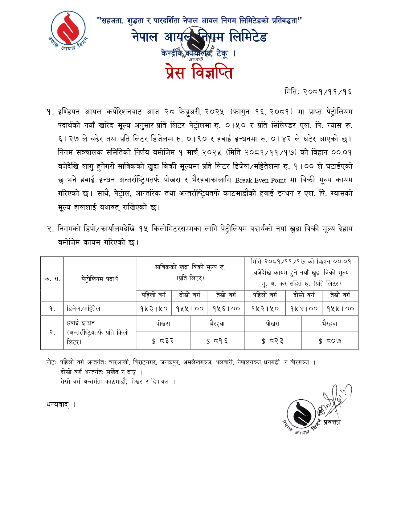 पेट्रोलको मूल्य भने यथावत रहेको निगमले जनाएको छ ।