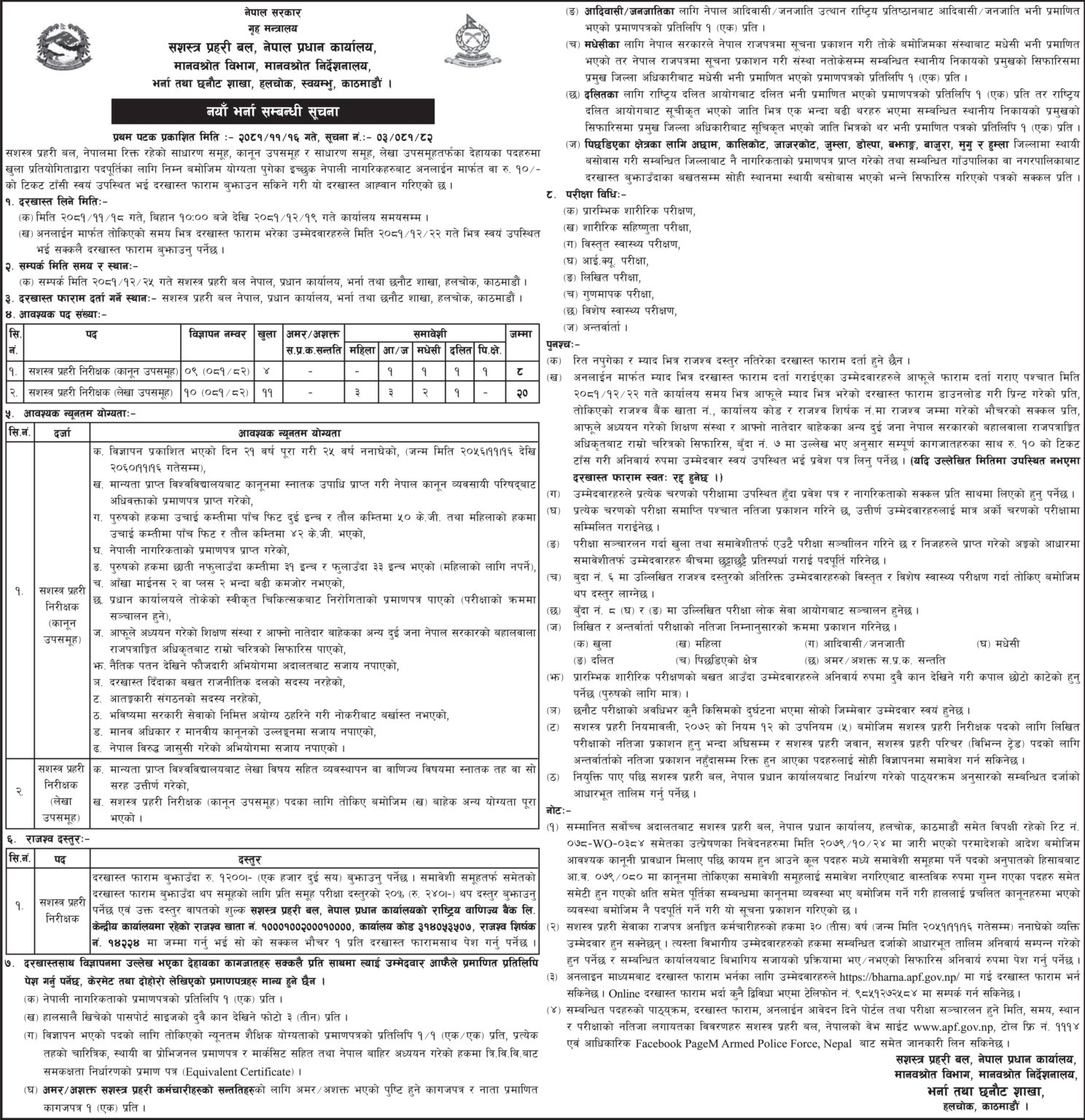 काठमाडौं । सशस्त्र प्रहरी बल, नेपालले २८ जना इन्स्पेक्टरका लागि भर्ना खुलाएको छ । कानून उपसमूहमा ८ जना र लेखा उपसमूहमा २० जना गरी जम्मा २८ जनाका लागि आवेदन खुलाएको हो ।