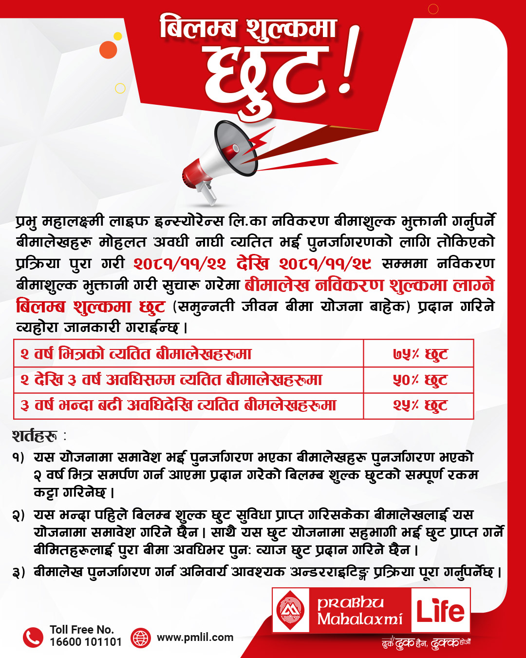 काठमडौं । प्रभु महालक्ष्मी लाइफ इन्स्योरेन्स कम्पनी लिमिटेडले व्यतित बीमालेख नविकरणमा छुट दिने भएको छ । कम्पनीले एक सूचना जारी गर्दै आज अथात फागुन २२ गतेदेखि २९ गतेसम्मको अवधिमा व्यतित बीमालेख नबिकरणमा ७५ प्रतिशत छुट दिने निर्णय गरेको हो ।