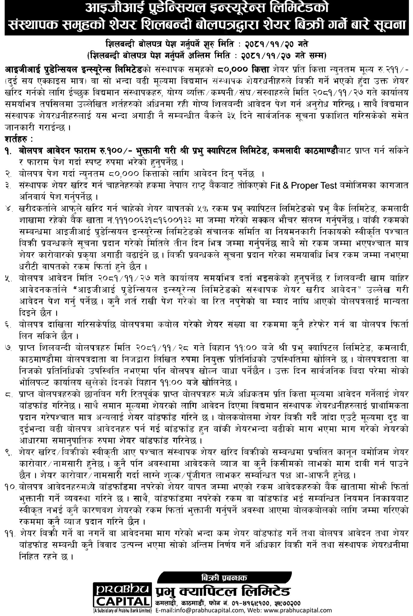 काठमाडौं । आइजीआई प्रुडेन्सियल इन्स्योरेन्स लिमिटेडले फागुन २० गतेदेखि लिलाम मार्फत् बिक्री खुला गरेको सेयरमा आवेदन दिने आज अन्तिम दिन रहेको छ । कम्पनीले लिलाम प्रक्रिया मार्फत बिक्री गर्न लागेको ८० हजार कित्ता संस्थापक सेयरमा आवेदन दिने आज अन्तिम दिन रहेको हो ।