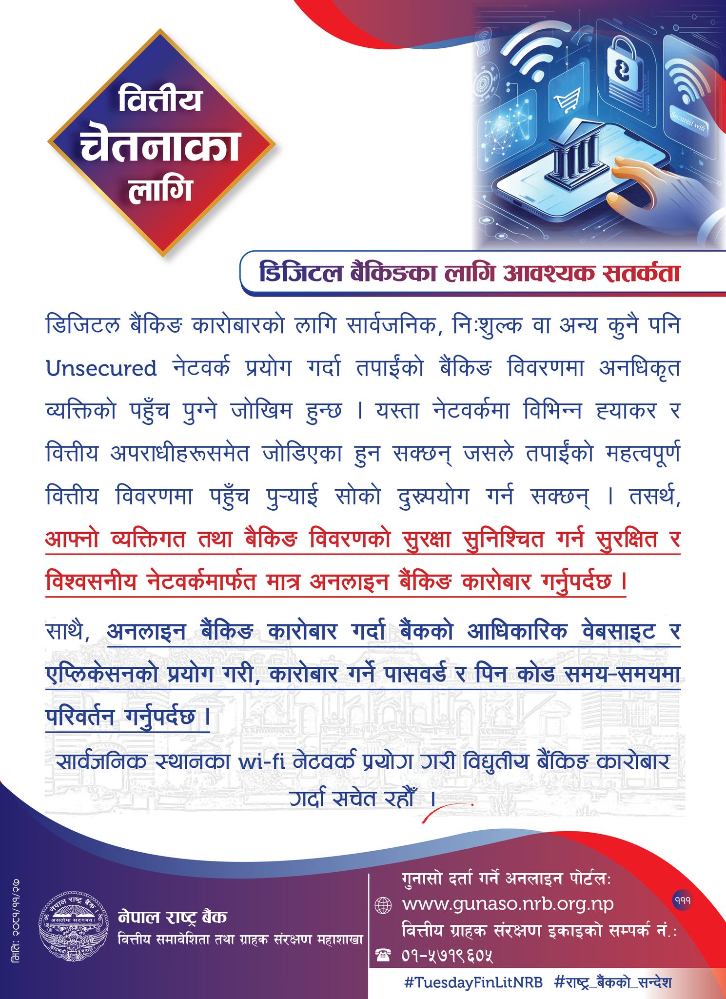 राष्ट्र बैंकको वित्तीय समावेशिता तथा ग्राहक संरक्षण महाशाखाले जारी गरेको सूचनामा ह्याकर तथा वित्तीय अपराधीहरूले असुरक्षित नेटवर्कको फाइदा उठाएर बैंकिङ विवरण चोरी गर्न सक्ने जोखिम औंल्याइएको छ । त्यसैले डिजिटल बैंकिङ कारोबार गर्दा बैंकको आधिकारिक वेबसाइट वा एप्लिकेसन प्रयोग गर्न, पासवर्ड तथा पिन कोड समय÷समयमा परिवर्तन गर्न, र सुरक्षित तथा विश्वसनीय नेटवर्कबाट मात्र कारोबार गर्न सुझाव दिइएको छ ।