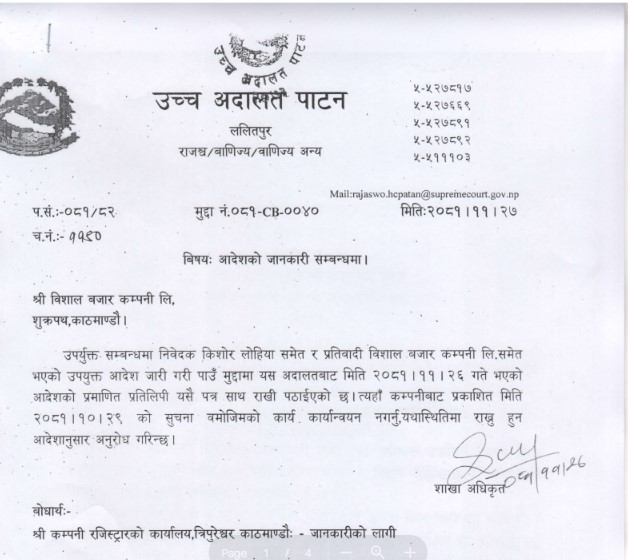 काठमाडौं । उच्च अदालत पाटनले विशाल बजार कम्पनी लिमिटेडको वार्षिक साधारण सभा (एजीएम) सम्बन्धी निर्णय कार्यान्वयन नगर्न आदेश दिएको छ । किशोर लोहिया लगायतका निवेदकहरूले कम्पनीको २०८१ साल माघ २९ गते दिएको निवदेनमा उच्च अदालत पाटनले एजीएम सम्बन्धी निर्णय कार्यान्वयन नगर्न आदेश दिएको हो ।