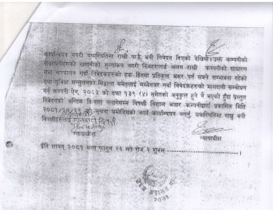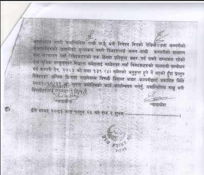 आदेश अनुसार, कम्पनीको वार्षिक साधारण सभासम्बन्धी निर्णय कार्यान्वयन नगर्नू र यथास्थितिमा राख्नु भन्ने व्यवस्था गरिएको छ । निवेदकहरूका तर्फबाट वरिष्ठ अधिवक्ताद्वय शम्भु थापा, सतिष कृष्ण खरेल तथा अधिवक्ताहरू युवराज बन्जाडे र दीपेन्द्र झाले बहस गरेका थिए । अदालतले कम्पनी ऐन, २०६३ को दफा १३९ (४) लाई आधार मान्दै सेयरधनीहरूको लगानीको मूल्यांकन नगरी कम्पनीको साधारण सभा सञ्चालन गर्दा उनीहरूको हक–हितमा प्रतिकुल असर पर्ने सम्भावना रहेको ठहर गरेको छ ।