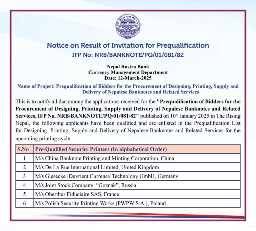 नेपाल राष्ट्र बैंकले तोकेको पूर्व योग्यता पुरा गरेका ६ कम्पनीले राष्ट्र बैंकले नोट छपाईका लागि खरिद प्रस्ताव आह्वान गर्दा प्रतिस्पर्धा गर्न पाउनेछन् । तिमध्ये एक कम्पनीले राष्ट्र बैंकले खरिद प्रस्ताव आह्वान गर्दा नोट छपाईको जिम्मेवारी पाउनेछन् । आवेदन दिएकामध्ये नोट छपाईको लागि राष्ट्र बैंकले तोकेको पुर्व योग्यता पुरा गर्ने कम्पनीमा चीनको चाइना बैंकनोट प्रिन्टिङ एन्ड मिन्टिङ कर्पोरसन, बेलायतको डे ला रुई इन्टरनेसन लिमिटेड, जर्मनीको जिसेकी प्लस डेभ्रिएन्ट करेन्सी टेक्नोलोजी, रुसको जोइन्ट स्टक कम्पनी ‘गोज्नाक’, फ्रान्सको अवेर्थर फिडुसियर र पोल्याण्डको पोलीस सेक्युरीटी प्रिन्टिङ वर्कस् रहेका छन् । आगामी चरणको लागि यी ६ कम्पनीहरु मात्रै नेपाली नोट छपाई लागि योग्य हुनेछन् ।