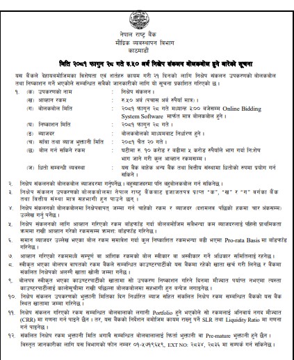 बैंकहरुले त्यसरी राखेको निक्षेपको ब्याजदर भने बोल कबोलका माध्यमबाट निर्धारण हुनेछ । अर्थात् सबैभन्दा थोरै ब्याजदर कबोल गर्ने बैंक तथा वित्तीय संस्थाको निक्षेप राष्ट्र बैंकले स्वीकार गर्ने राष्ट्र बैंकले जनाएको छ । त्यसका लागि आज दिउँसो ३ बजे अनलाई माध्यमबाट बोलकबोल गरिने छ ।