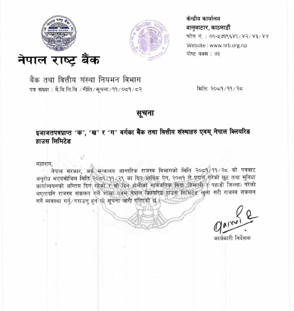 आन्तरिक राजस्व विभागको २०८१ साल फागनु २८ गतेको पत्र अनुसार रावस्व संकलनको व्यवस्था मिलाउन केन्द्रीय बैंकले क, ख र ग वर्गका बैंक तथा वित्तीय संस्था र नेपाल क्लियरिङ हाउसलाई अनुरोध गरेको हो ।