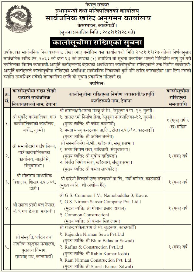 यसैगरी सुवोध खतिवडा मुख्य व्यक्ति भएको सनम निर्माण सेवा संखुवासभा, कमल सापकोटा मुख्य व्यक्ति भएको निर्जरा निर्माण सेवा सभापोखरी गाउँपालिका कार्यालयको सिफारिसको आधारमा एक वर्ष कालोसूचीमा परेका छन् ।